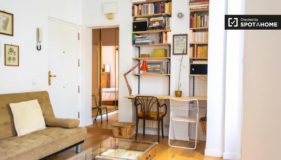 ** La biblioteca acogedora y bien leída ** _Porque amo un buen libro, o dos_ ** ¿Me gustará aquí? ** Probablemente. Pase el rato en la sala de estar ocupada, pero acogedora. Hay un montón de parafernalia tradicional relacionada con el mundo y la naturaleza. Además, hay estanterías de mezcolanza con todos los libros que necesita leer durante su estadía. **¿De Verdad? Dime más...** Puede esperar matices terrosos, atlas y carteles antiguos y mucha luz que ingresa a la cocina. Hornee algunas galletas mientras lava la ropa. Ríete con un amigo o dos en la mesa del comedor. Creemos que este lugar sería adecuado para una pareja interesada en el mundo y su historia. Será como vivir en un museo, aunque sea moderno. Trabajen juntos en el escritorio de la sala de estar. Dirígete a ver exposiciones en el Museo Reina Sofía. ** Sus 3 razones principales para vivir aquí: ** - Nos encanta que esté salpicado de mapas y cargado de libros. - Estás muy cerca de varias estaciones de metro y museos de arte. - Obtiene varios balcones pequeños en todas partes, incluso en el dormitorio y la sala de estar. ** Pero necesitas saber esto ... ** - El edificio no tiene ascensor. Subir al segundo piso no es tan malo. ** Su inspector de viviendas, Arassa, dijo: ** _ \"Me encanta esta propiedad. Se ve cómodo y sorprendente \". _ ** Ayúdame a decidir ... ** Este es un segundo piso, apartamento de 1 dormitorio en la calle de Argumosa, Madrid. Obtenga aire fresco en uno de los varios balcones pequeños. La cocina está equipada y tiene lavadora. Es perfecto para quienes gustan de un sentimiento acogedor y nostálgico. Hay libros para apelar a su sensibilidad literaria. Visita el museo Reina Sofía para obtener aún más cultura.
