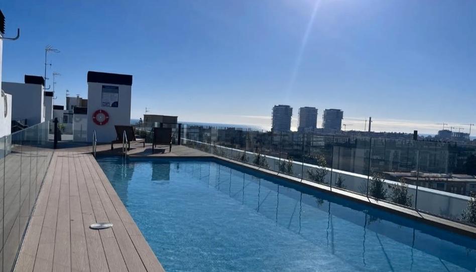 -Piscina-solarium comunitaria en la azotea, con vistas panorámicas al mar, con zona de hamacas y sombrillas.