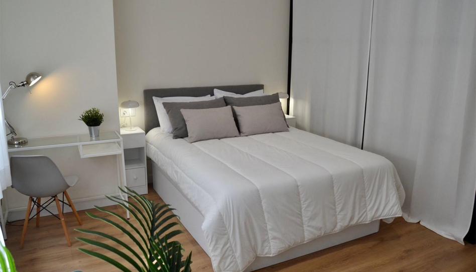 Dormitorio luminoso con ventana a la calle peatonal, tiene una cama de matrimonio de 1.50 metros en canape, mesa de estudio equipada y armario empotrado de 1,50 metros.