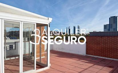 Ático espectacular de 80 m² distribuidos en 2 dormitorios (antes 3), terraza de uso privativo de 40m2, amplio salón con acceso a terraza de 8m2 y cocina completamente equipada y amueblada con salida a tendedero acristalado. La vivienda es exterior con gran luminosidad, dispone de aire acondicionado por split en salón y habitación principal, se entrega amueblado. Plaza de garaje con capacidad para 2 coches y gastos de comunidad incluidos en la renta. Animales a consultar. Finca ajardinada con ascensor ubicada en zona con todos los servicios, a pocos minutos minutos de Metro "Valdezarza"(L7) y "Antonio Machado" (L7).