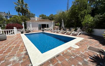 Esta villa independiente, totalmente amueblada y renovada, con piscina privada, se encuentra en la zona residencial de El Rosario (Marbella Este) y está disponible para alquilar por larga temporada. Se trata de una propiedad muy especial y poco habitual hoy en día, ya que ha sido renovada con mucho gusto conservando su estilo andalusí-morisco tradicional. La villa cuenta con un luminoso salón con techos altos y una cocina de concepto abierto con comedor situado a un nivel diferente, lo que permite disfrutar de las vistas hacia el salón y la zona de la piscina a través de grandes ventanales correderos de suelo a techo. Dispone de tres dormitorios distribuidos de forma que se garantiza la privacidad. El dormitorio principal incluye un baño en suite de diseño abierto y amplios armarios. Los otros dos dormitorios comparten un baño con ducha: uno de ellos es doble y el otro está amueblado con una cama individual y un escritorio, lo que lo hace ideal para tele-trabajar. La propiedad se ubica en una parcela elevada y se accede a ella a través de una rampa empinada que conduce al doble aparcamiento cubierto y a la entrada principal. La vivienda dispone de portones eléctricos y el terreno es de fácil mantenimiento, ya que la zona de la piscina está totalmente solada. Además, el precio del alquiler incluye un jardinero que se encarga del cuidado de la piscina y la parcela. La ubicación es muy práctica: a tan solo 800 metros hay un supermercado, farmacia, restaurantes y el Royal Tennis Club. El centro de Marbella está a solo 6 km, mientras que el campo de golf Santa Clara, Marbella Golf, la playa y el Hospital Costa del Sol se encuentran a menos de 2 km de distancia. El precio mensual de alquiler es de 4.500€, con los gastos de electricidad, agua, internet y alarma aparte, según consumo. No cobramos comisión al inquilino.