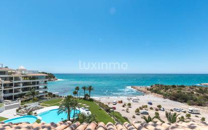 Penthouse en primera línea Mascarat en la casa de élite Mascarat Beach. El edificio en el que se encuentra el apartamento está construido en la costa de Mascarat con acceso directo a la playa de Mascarat. El apartamento tiene una superficie total de 407 m2 y una superficie habitable de 367 m2, con dos amplias terrazas y vistas directas al mar. Al entrar en el apartamento se accede al vestíbulo desde el cual se puede acceder al amplio salón con acceso a una terraza con vistas al mar y vistas panorámicas, cocina individual (totalmente equipada) y lavadero, 3 dormitorios con armarios empotrados y dos baños (duchas). La casa cuenta con una amplia zona de recreo, piscina interior y exterior, sauna, gimnasio, pista de tenis. EQUIPAMIENTO: Cocina totalmente equipada, aire acondicionado central, internet, chimenea, calefacción central de gas, armarios empotrados, dos terrazas, jacuzzi. ZONA: El edificio está construido en Mascarat, provincia de Alicante, a sólo 10 minutos del centro de Altea y Calpe.
