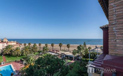 Excelente ático en Isla Canela, quinta planta. Primera línea de playa. De tres dormitorios con armarios empotrados y dos baños (uno en suite), salón-comedor con chimenea y salida directa a la inmensa terraza con vistas a la zona comunitaria y a la playa, amplia cocina equipada, ventanas climalit, a/a centralizado. Amueblado, parking interior. La zona comunitaria con extensos jardines, piscina adultos e infantil, parque, cuatro pistas de pádel y restaurante con zona interior exclusiva. Salida al paseo marítimo y muy cerca de todos los servicios. Año de construcción 1996. Orientación sur-este.
