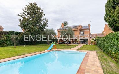 Engel & Völkers presenta, en exclusiva, esta elegante vivienda familiar, con arquitectura contemporánea, construcción de alta calidad y perfecta integración con el entorno natural. Sus tres plantas ofrecen un diseño funcional, luminoso y fluido, con estancias amplias, bien proporcionadas y sin pasillos, optimizando la distribución de los espacios. La planta principal destaca por su abundante luz natural gracias a amplios ventanales con vistas al jardín. Cuenta con salón, comedor independiente, despacho y cocina recientemente reformada, equipada con mobiliario y electrodomésticos de alta gama, con acceso directo al garaje y al patio de servicio. En la planta superior se sitúa la zona de descanso, compuesta por cinco dormitorios y tres cuartos de baño, uno de ellos en suite. La planta sótano ofrece un espacio versátil que se adapta a diferentes usos. Dispone de una suite de servicio, lavandería y una amplia sala con múltiples posibilidades: gimnasio, sala de cine o zona de ocio. El exterior de la propiedad es un auténtico santuario de calma y privacidad. El jardín cuidadosamente diseñado, con piscina climatizada, invita al descanso y al disfrute durante todo el año. La zona exterior se completa con un cuarto de baño y trastero, con la posibilidad de transformarse en sauna o área wellness. La vivienda integra soluciones de eficiencia energética y sostenibilidad, como paneles solares, carpintería exterior de alta eficiencia y cargador para vehículo eléctrico. Con una ubicación privilegiada, esta vivienda se encuentra en una urbanización privada con seguridad 24h, parada de autobús en la entrada de control y acceso directo al Monte del Pilar, un entorno natural protegido. A minutos de colegios de prestigio, tiendas y servicios, con inmejorables conexiones a Madrid por la A-6 y M-40.