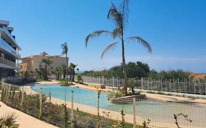 Descubre el lujo en este espectacular apartamento en primera línea de playa! Situado en el km 5 de las marinas, este inmueble de reciente construcción ofrece un estilo de vida inigualable. Con 98 m² construidos, cuenta con un amplio salón comedor con cocina abierta, ideal para disfrutar de momentos inolvidables. Los 3 dormitorios, uno de ellos en suite, y los 2 baños, todos con acabados de Porcelanosa, garantizan confort y elegancia. Imagina relajarte en la terraza, rodeado de un jardín mediterráneo y una impresionante piscina tipo playa. La urbanización ofrece seguridad privada y salida directa al mar, convirtiendo este lugar en un auténtico paraíso. Además, el aire acondicionado por conductos frío/calor y los suelos de gran formato aseguran un ambiente agradable durante todo el año. No dejes pasar la oportunidad de vivir en un entorno exclusivo. Este piso también incluye armarios empotrados, trastero y la posibilidad de adquirir una plaza de garaje por 20.000 € adicionales. ¡Contáctanos para más información y ven a conocer tu nuevo hogar!