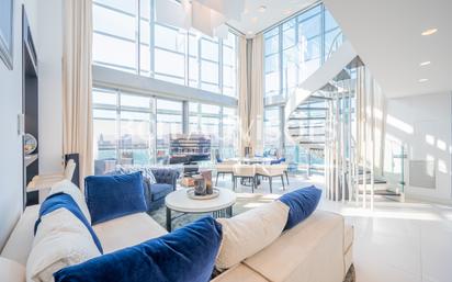 Impresionante ático dúplex con terraza y vistas panorámicas. Este ático de lujo en primera línea de playa es el hogar de tus sueños con una maravillosa terraza de 80 m2 y espectaculares vistas al mar Mediterráneo y a la ciudad. Se sitúa en el exclusivo edificio Illa del Mar, en el moderno barrio de Diagonal Mar de Barcelona, que ofrece vigilancia 24 horas, conserjería, 2 piscinas, jardín, pista de pádel, gimnasio, sauna y club social. Además, el precio incluye 2 plazas de parking y un trastero. La vivienda tiene 142 m2 construidos interiores y está en la última planta del edificio, que es la 22ª. Por lo tanto, la luminosidad es impresionante y además, la terraza acristalada en forma de L que la rodea por completo hace que la sensación de libertad en todas las estancias sea espectacular. La distribución une la luz natural, la privacidad y el dinamismo entre la zona interior y la zona exterior, que se fusionan para ofrecer un entorno extraordinario y único. En la planta principal, el increíble salón-comedor disfruta de luz natural durante todo el día. La cocina es independiente, se abre al salón mediante una gran ventana y está equipada con electrodomésticos de alta gama. Por último, hay una habitación en suite con cuarto de baño propio. Toda esta planta tiene acceso a la terraza con un gran jacuzzi, sofás y zona chill-out y todo el espacio que quieras para tus reuniones y comidas con amigos y familiares. La planta superior dispone de un espacio abierto con vistas panorámicas, ideal como lugar de trabajo, ocio o lo que necesites. Esta zona se conecta con el fantástico dormitorio principal en suite con vestidor, cuarto de baño abierto con ducha, jacuzzi y unas maravillosas vistas al mar y a la ciudad. La vivienda está a 3 minutos caminando de la playa y al lado de una gran zona verde, el Parque de Diagonal Mar. Los alrededores disponen de numerosos servicios, un gran centro comercial y opciones de conexión con el resto de la ciudad por coche mediante la Avenida Diagonal y por transporte público. Este ático te ofrece un estilo de vida de lujo sin igual. No dudes en contactar con Bcn Advisors para conocerlo en primera persona. En nuestra web encontrarás muchos más inmuebles que los publicados aquí y además disponemos de un amplio catálogo privado de propiedades que pueden ajustarse a lo que estás buscando.