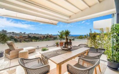 Impresionante ático dúplex de dos dormitorios en la comunidad cerrada Campanario Hills, Estepona. Situado a poca distancia en coche de la playa y de los servicios locales; el complejo ofrece instalaciones exclusivas como un gimnasio completo, jacuzzi, sauna, piscina comunitaria y jardines inmaculados. La propiedad tiene una sala de estar y comedor con acceso a una terraza privada que está parcialmente cerrada con cortinas de vidrio; una cocina totalmente equipada de planta abierta; suite principal; dormitorio de invitados; y baño de invitados. El nivel superior conduce al solárium privado con sala de estar, cocina al aire libre y piscina privada. Otras características incluyen aire acondicionado frío y caliente, calefacción por suelo radiante, dos plazas de aparcamiento privadas y un trastero.