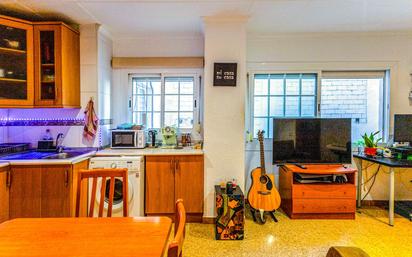 Salón comedor amplio con cocina americana y dos grandes ventanas a patio interior.