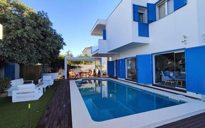 magnifico chalet situado en playa de islantilla -urbasur y muy cerca de la playa. chalet vivienda dotada iluminación exterior ERG, pérgola bioclimática, cámaras de seguridad, aire acondicionado/calefacción en toda la casa, suelo de parquet en piscina. La parcela consta de 370 m2 aproximadamente, con piscina privada con suelo de madera. La vivienda consta de cuatro amplios dormitorios, uno de ellos en planta baja, salón comedor , cocina equipada, tres baños, trastero, solarium, baño exterior, garaje para dos coches y solarium. La vivienda se vende amueblada. Características básicas Chalet adosado 3 plantas 165 m² construidos 4 habitaciones 4 baños Parcela de 370 m² Terraza y balcón Plaza de garaje incluida en el precio Segunda mano/buen estado Armarios empotrados Trastero Orientación sur, oeste Construido en 2016 Calefacción individual