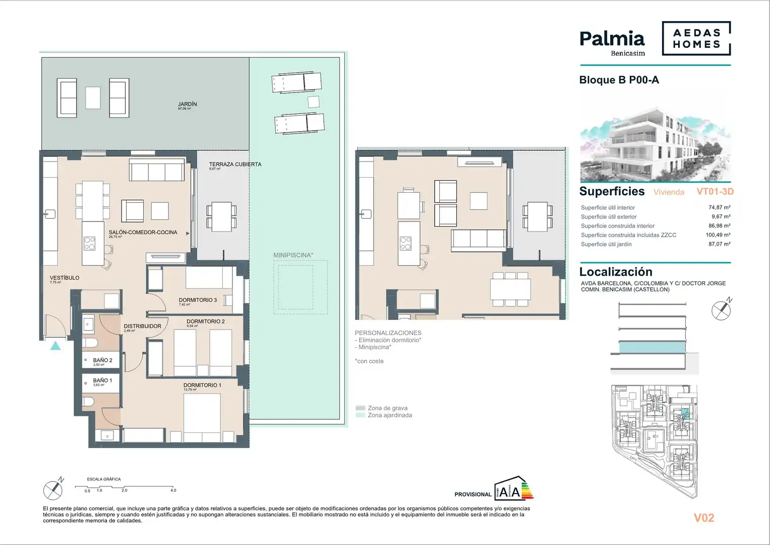 “Las imágenes mostradas son una aproximación lo más fiel posible del resultado final del inmueble proyectado, pudiendo darse modificaciones derivadas de exigencias técnicas o jurídicas, siempre que estén justificadas y no supongan una alteración sustancial del objeto, calidad de los materiales y/o precio. El mobiliario mostrado no está incluido, siendo el equipamiento del inmueble el indicado en la memoria de calidades”.