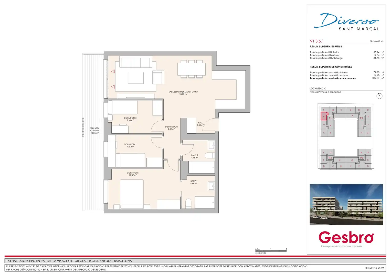 El proyecto ofrecerá diferentes tipologías de vivienda con amplias terrazas, además de pisos de 2, 3 y 4 dormitorios, diseñados para ofrecer funcionalidad, confort y luminosidad. Todas las viviendas incluyen plaza de garaje y trastero.