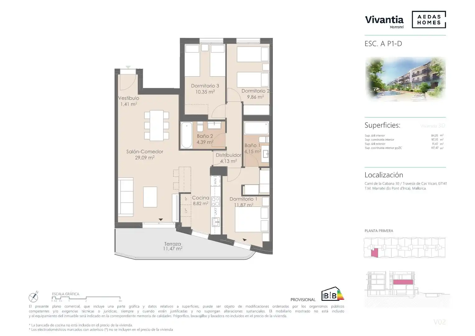 “Las imágenes mostradas son una aproximación lo más fiel posible del resultado final del inmueble proyectado, pudiendo darse modificaciones derivadas de exigencias técnicas o jurídicas, siempre que estén justificadas y no supongan una alteración sustancial del objeto, calidad de los materiales y/o precio. El mobiliario mostrado no está incluido, siendo el equipamiento del inmueble el indicado en la memoria de calidades”.
