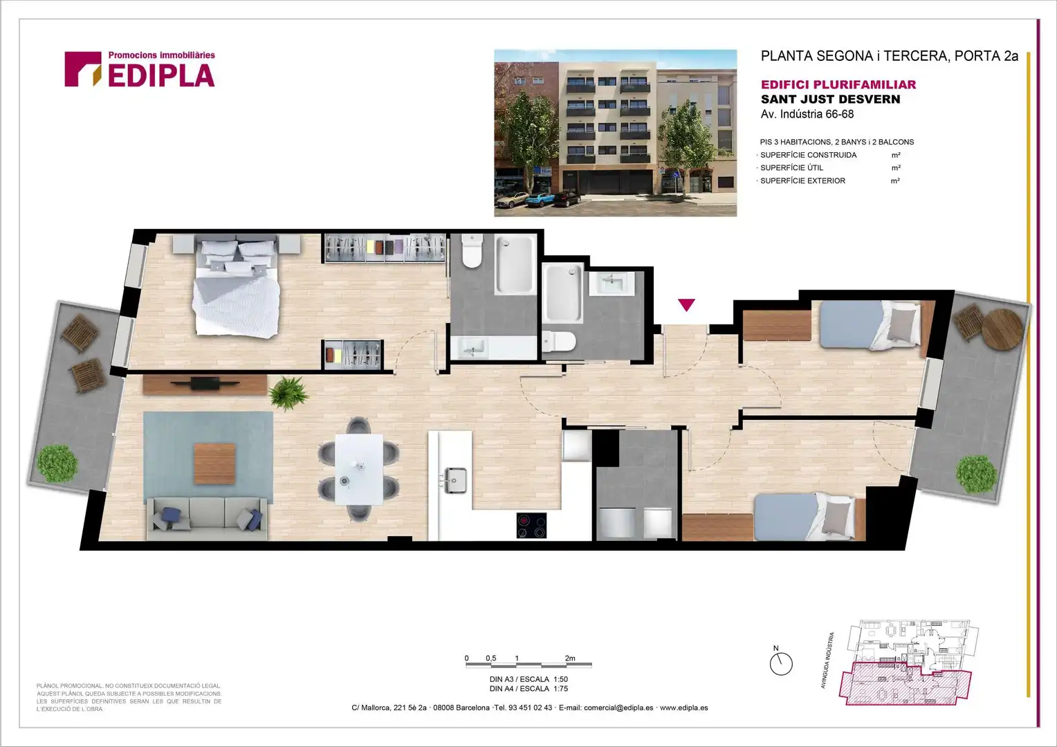 El edificio consta de 8 viviendas de 3 dormitorios con unas superfícies comprendidas entre 94 y 134 m2 construidos. Algunos de ellos, amplios dúplex con terrazas privadas. Parking opcional en la misma finca no incluido en el precio. Personalización de los acabados. Entrega prevista para finales de 2026. Vivir en el centro de Sant Just es ganar en calidad de vida, es ganar en tranquilidad, en un entorno inmejorable y cercano a todos los servicios, Sant Just Centre puede ser tu nuevo hogar
