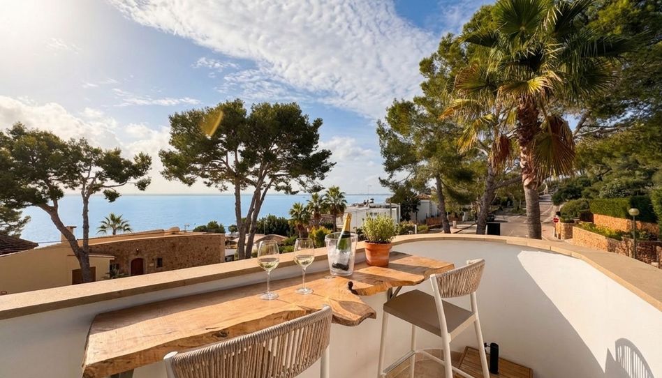 Desde el salón se accede a una terraza privada con vistas despejadas al mar, ideal para desayunos al sol o cenas íntimas. Las carpinterías exteriores que dan a la terraza son de aluminio con doble acristalamiento y persianas enrollables integradas, mientras que el resto de la vivienda conserva los cerramientos de madera típicos mallorquines, aportando autenticidad y encanto.