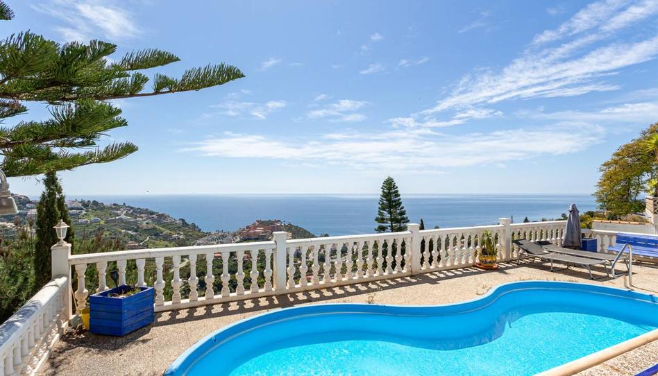 Preciosa casa situada en la Loma del Gato, a 10 minutos en coche del centro de Almuñécar y sus fantásticas playas. Esta zona se encuentra muy cercana igualmente al acceso de la autovía. Disfruta de unas preciosas vistas al mar, la montaña y la misma ciudad. Por su orientación, sur, es muy soleada todo el día. En una parcela de 3.000m con el terreno en varias terrazas se encuentra esta casa de 220m construidos con orientación Sur (muy soleada en invierno) divididos en 3 construcciones, una corresponde a la casa principal y las otras son dos apartamentos-estudio (140 m2 en total), ideal como casa de invitados y una bonita piscina, así como diferentes jardines y árboles frutales. En la entrada a la vivienda tiene una zona de parking para 4 vehículos y una parte techada con una pérgola, además de tener la vivienda 2 garajes más cerrados (95 m2). La casa principal consta de 3 habitaciones dobles (una es un despacho) y las otras 2 habitaciones con vistas al mar, 2 cuartos de baño completos (uno de ellos en suite), cocina individual totalmente equipada con un lavadero y un office que se utiliza de comedor y que se comunica con el gran salón acogedor con chimenea, dividido en dos partes y la terraza con unas vistas maravillosas al mar. En el jardín hay varios trasteros para utensilios de jardinería y piscina. Los 2 apartamentos están a dos alturas diferentes y constan de salón, habitación, cocina y cuarto de baño completo, y tienen entrada independiente desde la calle. Placas solares que generan electricidad y calefacción central de gasoil. Una buena ocasión para adquirir un chalet estupendo en la Costa Tropical a un paso de la playa y del pueblo. Gastos de IBI: 1.000€ una vez al año... Sin comisión para el comprador..