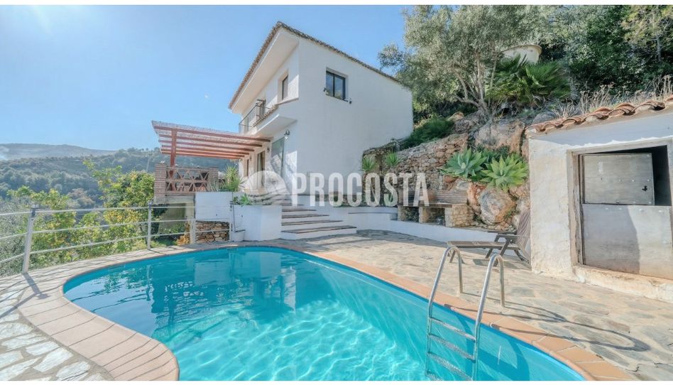 En la planta principal, tras una cómoda zona de aparcamiento, nos recibe un generoso porche cubierto con vistas abiertas a la sierra y un ligero horizonte de mar en la distancia. Un espacio perfecto para comidas al aire libre, reuniones familiares o simplemente disfrutar del atardecer. Frente al porche se encuentra la piscina privada, ideal para aprovechar el excelente clima de la zona prácticamente todo el año, y una agradable área arbolada que aporta sombra y frescor en los meses más cálidos.