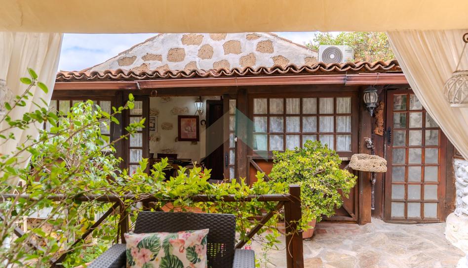 La casa principal cuenta con un jardín privado con patio, fuente decorativa y mobiliario exterior, perfecto para disfrutar del clima canario.
