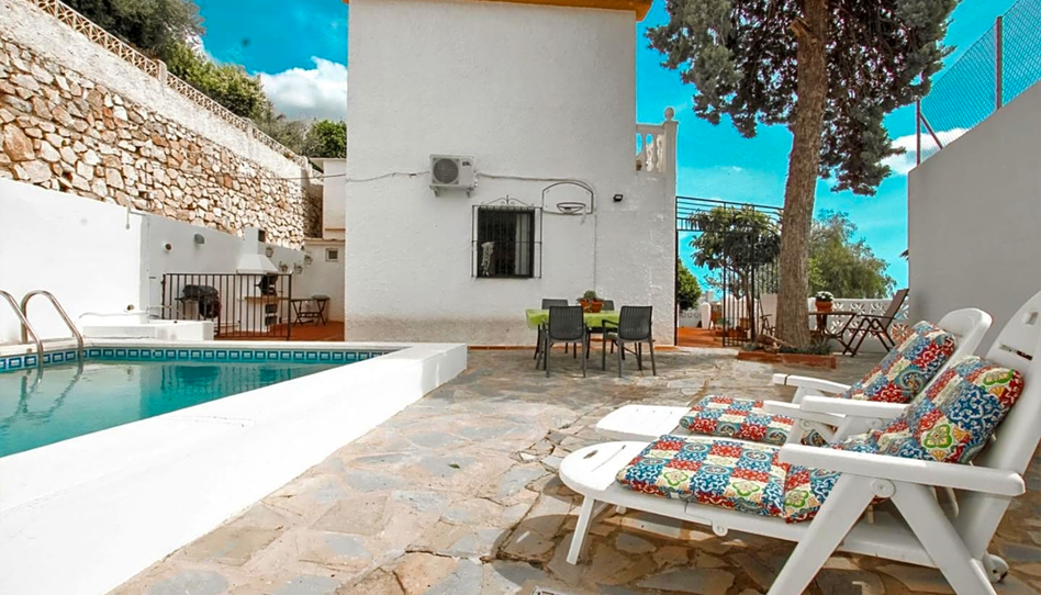 La parcela cuenta con distintas zonas para poder disfrutar del sol y de las vistas de al mar, tiene piscina, barbacoa, baño para piscina, ducha, 2 trasteros y una pérgola de madera junto la piscina.