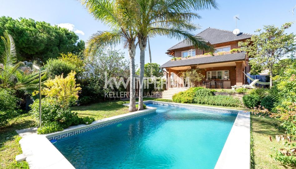 Atravesando de nuevo el salón-estar nos encontramos un acogedor comedor con posibilidad de unión, a través de puertas con cristal, a la gran cocina abierta que tiene la casa, donde una distribución en península se une con una barra a la zona office, que a su vez, tiene salida directa al magnífico jardín con piscina central y una generosa barbacoa situada en un lateral.