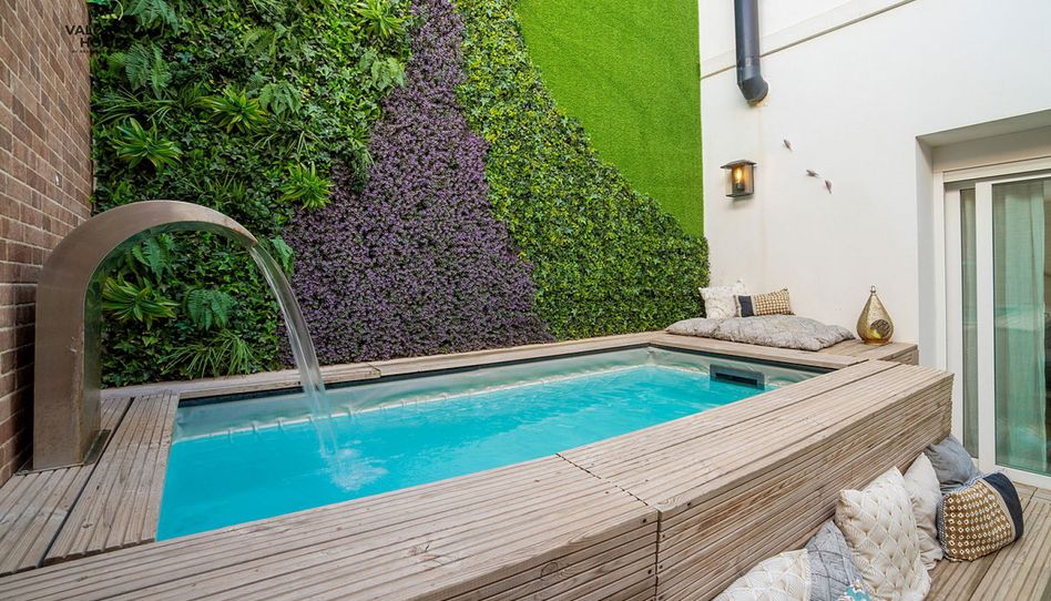En la planta baja encontramos el salón con cocina integrada, moderno y luminoso junto con un dormitorio y un baño completo. Desde aquí se accede a uno de lo grandes atractivos de la vivienda, un patio privado con piscina climatizada y jardín vertical, un autentico lujo en plena ciudad.