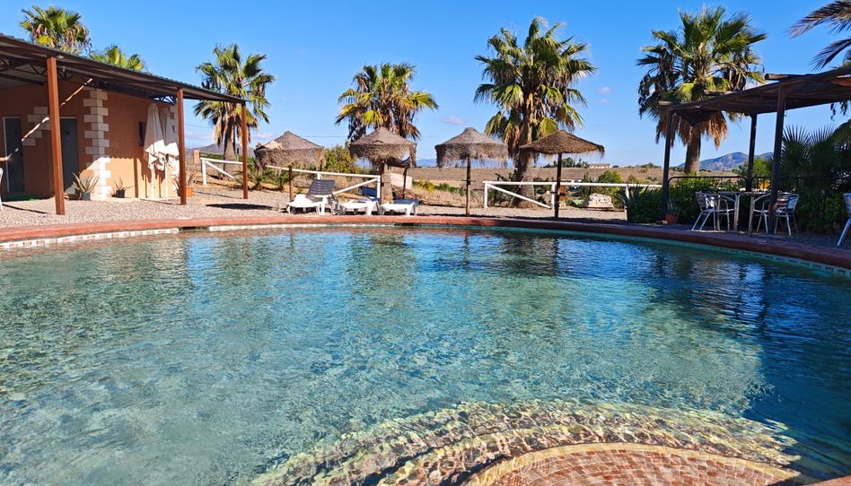 Gran piscina redonda en un patio enorme con zona de hamacas, además dispone de un gran salón de verano con mesas y sillas así como barra de bar con neveras, barbacoa, aseo de señoras y caballeros, otra zona cubierta junto a la piscina con mesas y vegetación.
