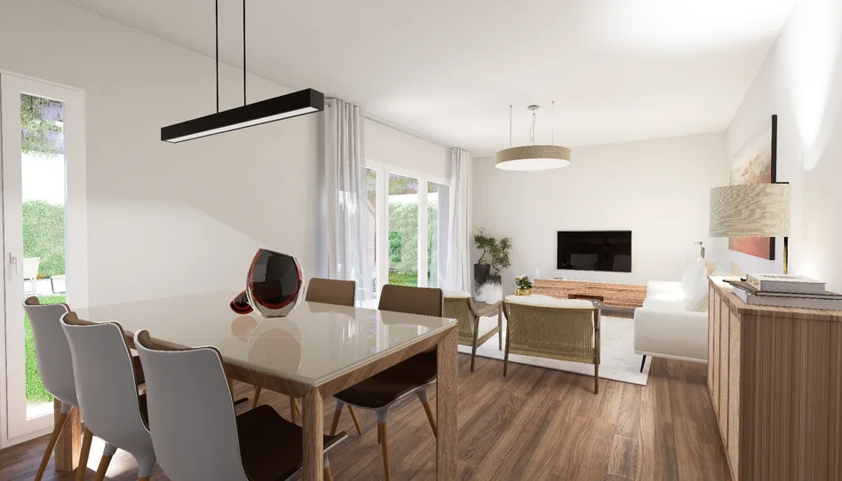 Elegante cocina integrada en el salón, ideal para disfrutar en familia y con salida a la amplia parcela.
