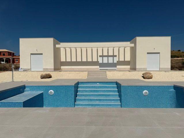 This superb modern villa will be built according to your tastes and with high quality finishes.\nThere are 3 models possible:\nModel of 150m²: 323,000€ (includes the villa all in one floor with 3 bedrooms & 2 bathrooms, 8x4m swimming pool and land to the value of 30,000€\nModel of 160m²: 349,000€ (includes the villa all in one floor with 3-4 bedrooms & 2-3 bathrooms, 8x4m swimming pool and land to the value of 30,000€\nModel of 180m²: 379,000€ (includes the villa with 3-4 bedrooms, 2-3 bathrooms, 8x4m swimming pool and land to the value of 30,000€\n\nThe villa includes 3/4 bedrooms (the master bedroom has an en-suite bathroom), a family bathroom. The living area consists of an open plan kitchen, a living/dining room and a very large covered terrace. The villa can be built in 8 months, with the finishes of your choice. \nIncluded in the price :-\n 3-4 bedroom villa depending on the model with fitted wardrobes in the bedrooms\n- Good quality fitted kitchen with Silestone worktop (to choose between different models)\n- Bathrooms with safety shower screen, vanity unit with mirror and Roca and/or Ramon Soler brand taps (to choose)\n- Built-in fireplace\n- Installation for air conditioning (heat/cold) in the living room, kitchen, bathrooms and hallways\n- Electric blinds\n- Connection to running water and electricity (for Pinoso plots)\n- Gate with pre-installation for engine and lighting- Land of 3,000m² fenced or a maximum of 210m linear around the house\n- Plot of at least 10,000m² (land to the value of 30,000€ included in the price)\n- Very good quality tiles (range to choose between 10 models porcelain)\n- EEC approved insulation (ceiling, walls and floors), guaranteed energy certificate B\n- LED lighting in the kitchen, bathrooms and bedrooms\n- Complete swimming pool (motor, filtration system), 1,5 meters of surrounding terraces included\n- Interior doors to choose between 2 models and colours\n- Approved septic tank\n- Very good quality windows and doors (German brand)\n- Projects, building permits, architect, concrete quality control, insulation, waterproofing of the roof and terrace. \nIn addition, possibility of building an outdoor kitchen, garage for 1 or more cars. These villas can also be built in the area of Hondon, La Romana, Aspe, Catral or Dolores. Do not hesitate to contact us for more information.