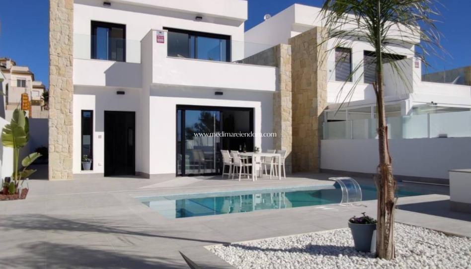 La villa tiene 3 dormitorios, 4 baños, amplio salón con cocina abierta, parcela de 212-310 m2 con piscina privada.