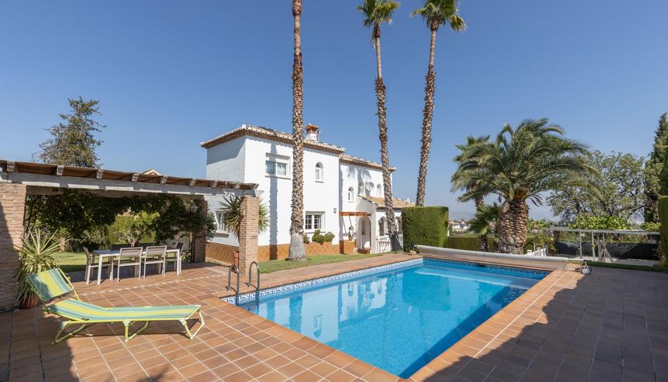 Mi exterior está pensado para disfrutar: tengo zona ajardinada con palmeras y césped, una piscina privada, varios espacios al aire libre y un porche desde el que puedes ver Granada totalmente despejada.