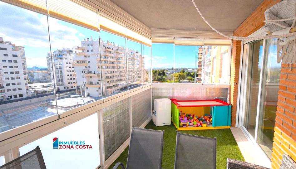* Terraza de unos 10 m² con cortinas de cristal (sin perfilería), ideal para disfrutarla durante todo el año, con toldos nuevos y climatizada con máquina de aire frío/calor de 3.000 frigorías. En ella podremos disfrutar de vistas al mar visualizando a lo lejos el puerto de Valencia y unas vistas despejadas a las zonas comunes.