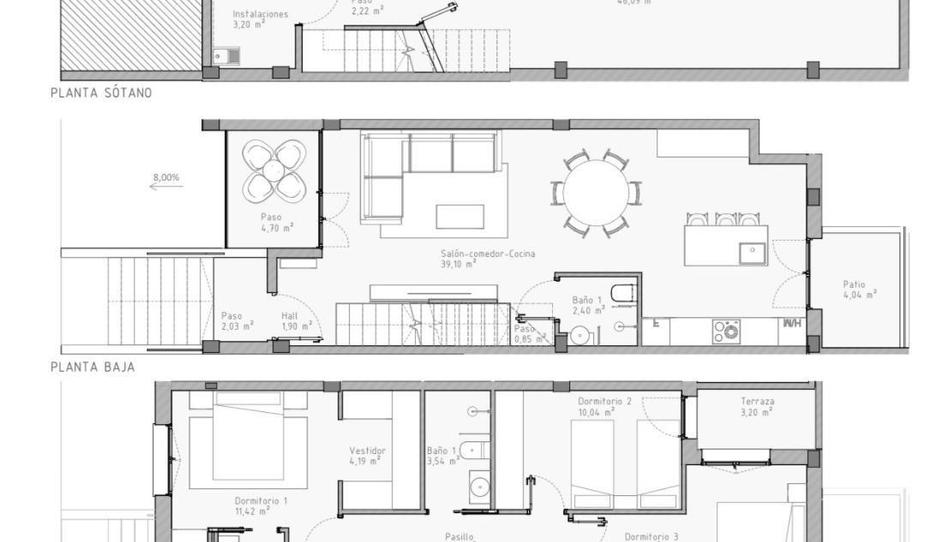 La vivienda Consta de 184 m2 distribuidos en dos plantas más planta sótano de 31 m2. En planta baja cuenta con amplio salón comedor con cocina integrada todo en una linea moderna dinámica, con grandes ventanales y acceso al porche cuenta con galería y aseo en primera planta . En la seguda planta encontramos tres amplios dormitorios, el principal tipo suite con armarios empotrados, y acceso a una de las terrazas. Dos baños, uno con bañera y otro con pie de ducha. Ventanas dobles y climalit de aluminio marrn, puertas blancas en DM, pre-instalacion A.A. y calefacción centralizado. Toda la vivienda va con un diseño exclusivo e innovador ideal para el comienzo de una nueva vida en una zona residencial muy tranquila y cómoda.