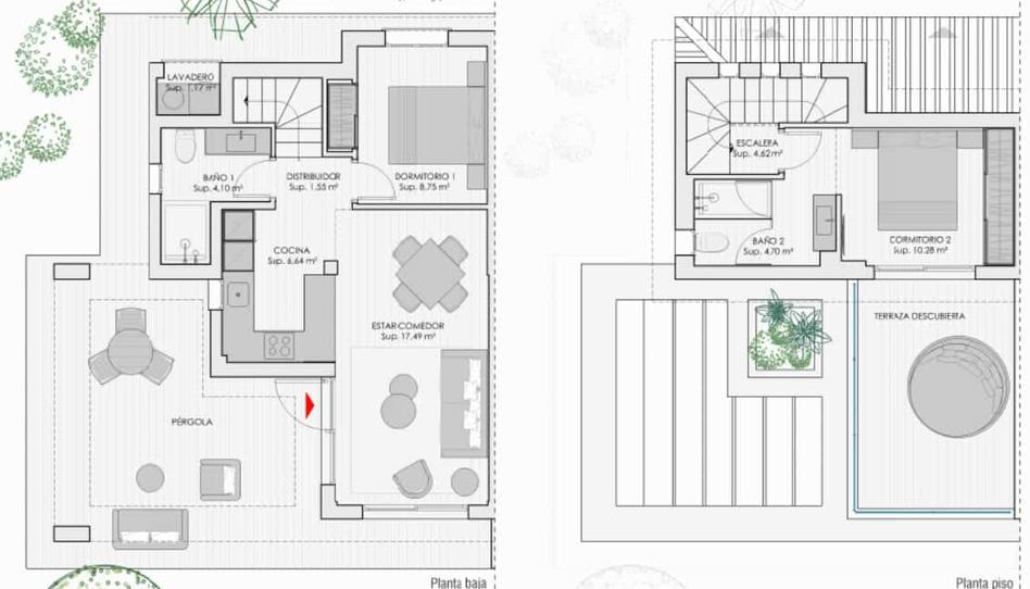 Con dos dormitorios, dos baños distribuidos en dos plantas en un total de 75m2 de vivienda, en una parcela entre 121m2 y 300m2.
