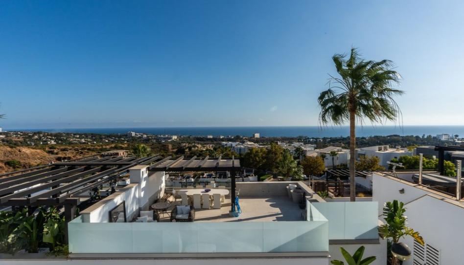 En la planta superior se encuentran tres amplios y luminosos dormitorios. El dormitorio principal dispone de baño en suite, mientras que los otros dos comparten un baño completo. Desde esta planta se accede a una espectacular terraza de 50 m², donde podrás disfrutar de las mejores vistas al mar y a las montañas de Marbella, el lugar perfecto para descansar o celebrar reuniones al aire libre.