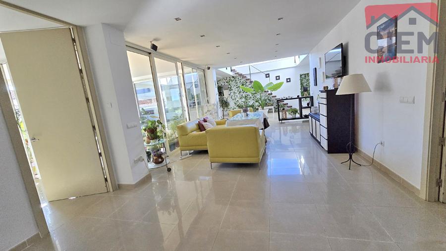 Tanto el salón como el dormitorio principal tienen acceso a través de grandes cristaleras, a la terraza de la vivienda, la cual tiene una superficie aprox. de 25 m2 y se encuentra techada. La planta primera, de una superficie de 35 m2, está formada por un estudio (doble altura del salón), dormitorio con terraza y baño.
