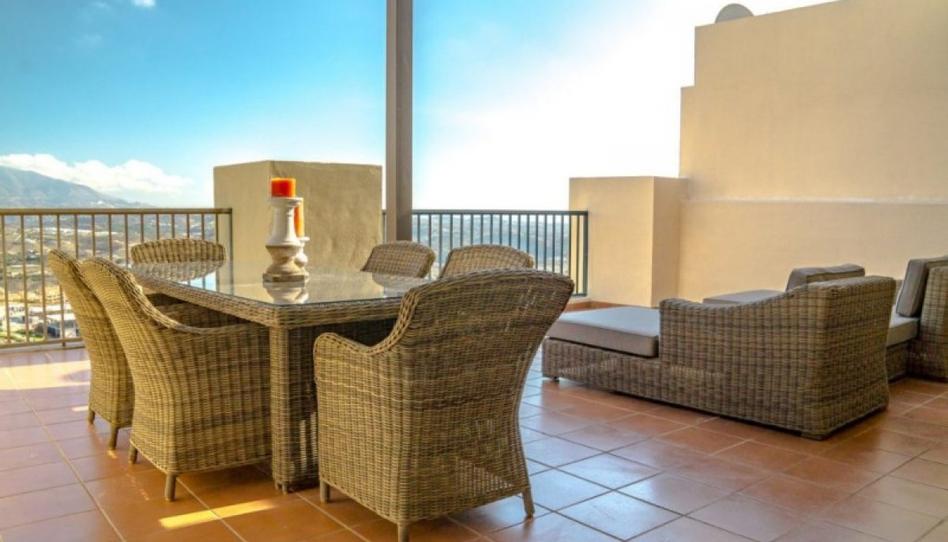 Atico en venta en Cala de Mijas, Mijas Costa con 2 dormitorios y 2 baños, con comunitaria piscina. Respecto a las dimensiones, la propiedad presenta 105 m² construidos y 43 m² de terraza. Tiene las siguientes características vistas al jardín, vistas a la piscina, servicios cercanos, transporte cercano, aire acondicionado, terraza cubierta, suelos de mármol, terraza privada, cocina totalmente equipada y cristal doble.