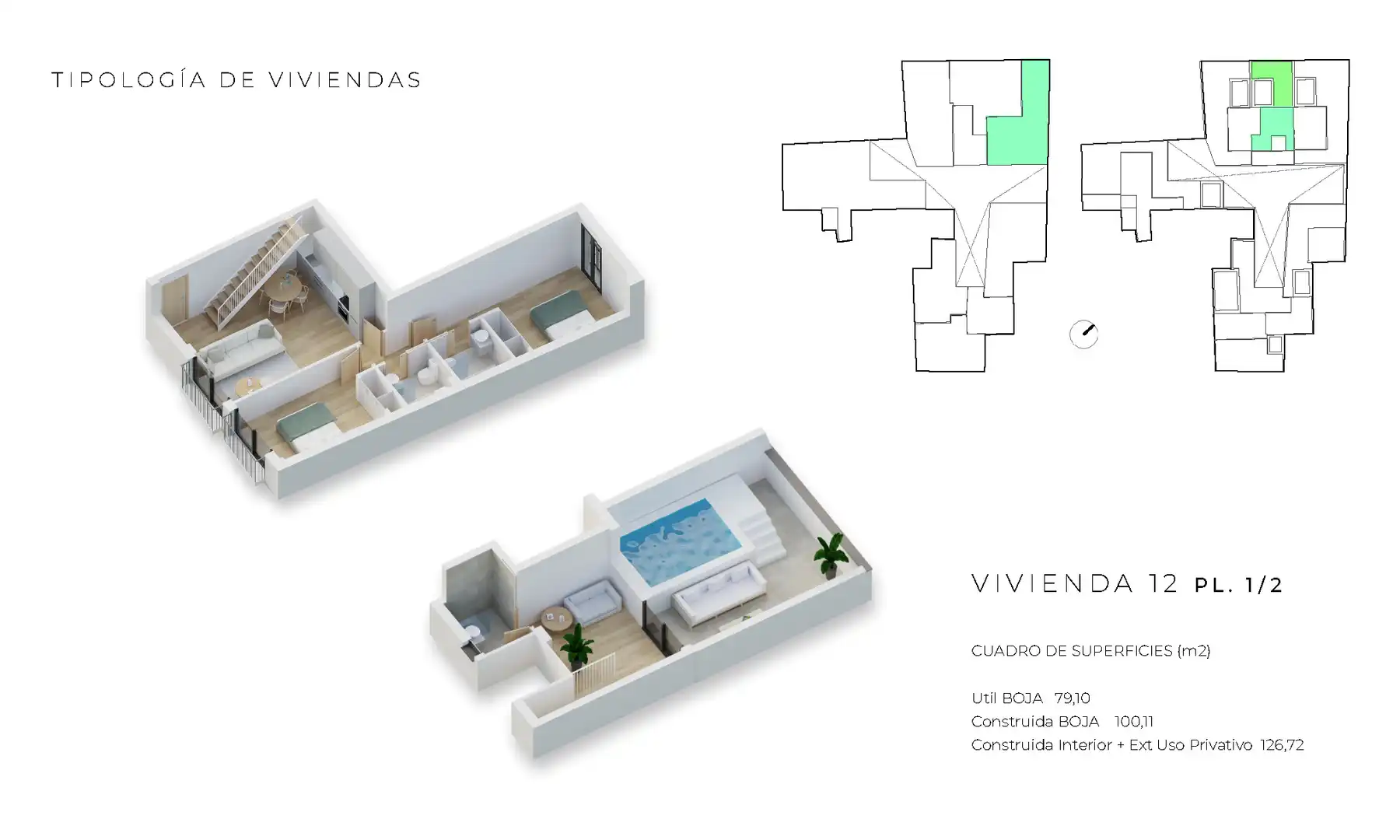 This development offers homes with between 1 and 3 bedrooms, with a choice of ground floor apartments and duplex penthouses. Some ground floor apartments include a private terrace and the duplex penthouses have the option of a private swimming pool or jacuzzi. Similarly, you can choose garages and storage rooms, which are located on the ground floor of the same building. Its construction stands out for its cutting-edge design and quality finishes. To this end, emphasis has been placed on both thermal and acoustic insulation, using air chambers and windows with thermal breaks and double glazing on the façade, as well as aluminum blinds with thermal insulation. In the pursuit of energy efficiency, LED lights with presence detectors will be installed in the common areas, as well as aerothermal energy for hot water.