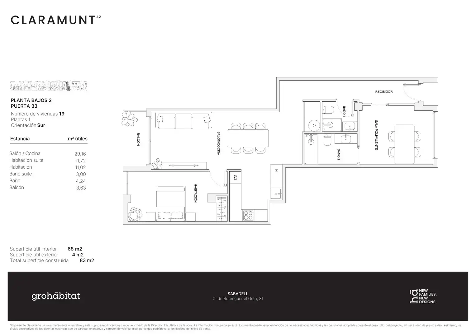 Promoción de 19 viviendas de obra nueva, todas con 2 habitaciones, 2 baños y balcón, diseñadas para ofrecer confort, funcionalidad y luz natural durante todo el día gracias a su orientación sur.