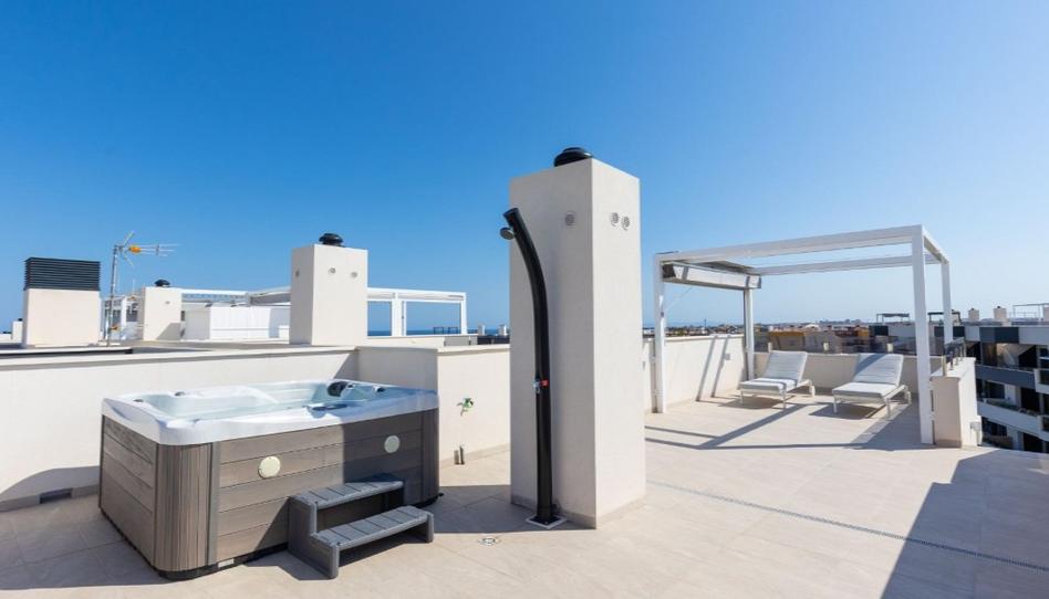 Descubre este atractivo ático ubicado en el exclusivo complejo residencial Amanecer Deluxe, una urbanización moderna y tranquila conocida por su diseño contemporáneo y excelente ubicación. La propiedad ofrece 75m² de superficie construida, que incluye 2 amplios dormitorios, 2 baños completos, una cocina americana totalmente equipada y un amplio y luminoso salón-comedor con acceso a una acogedora terraza. Además, cuenta con un espectacular solárium privado de 60m² con jacuzzi, perfecto para disfrutar del clima mediterráneo, tomar el sol o relajarse con vistas abiertas. Esta nueva zona residencial ofrece todos los servicios esenciales cercanos: supermercados, centros deportivos, zonas de ocio, restaurantes, etc. Situado a pocos minutos en coche tanto del centro de Torrevieja como de Orihuela Costa, en una zona estratégica con próximas mejoras de infraestructuras y una mejor conectividad futura con las playas cercanas. Ideal tanto como residencia permanente como como propiedad vacacional o de inversión.