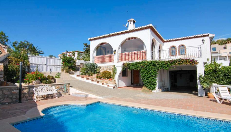 La zona exterior ofrece un cuidado jardín mediterráneo con palmeras y rincones sombreados para relajarse. Una piscina privada completa el conjunto, rodeada de zonas para tomar el sol y jardines.