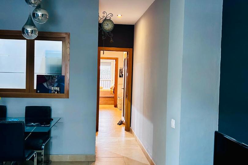 Vivienda de 107 m2 construidos, con salón comedor, cocina amueblada, dos dormitorios y dos baños y un aseo, y espectacular sala de estar insonorizada. La vivienda se distribuye en dos zonas separadas, de un lado está el salón comedor, la cocina y dos dormitorios, con un baño en el dormitorio principal, un pequeño vestidor en su interior y un gran patio con lavadero. El dormitorio secundario dispone asimismo de un pequeño patio. Además dispone de una despensa y un armario vestidor más otro armario de almacenaje. La otra ala de la vivienda dispone de una sala de paso de grandes dimensiones, un aseo y una sala insonorizada ideal para cualquier actividad que entrañe la necesidad de aislamiento acústico.