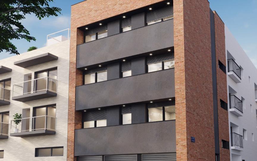 Edificio de obra vista, aplacado de color gris antracita. Acabados de gran calidad.