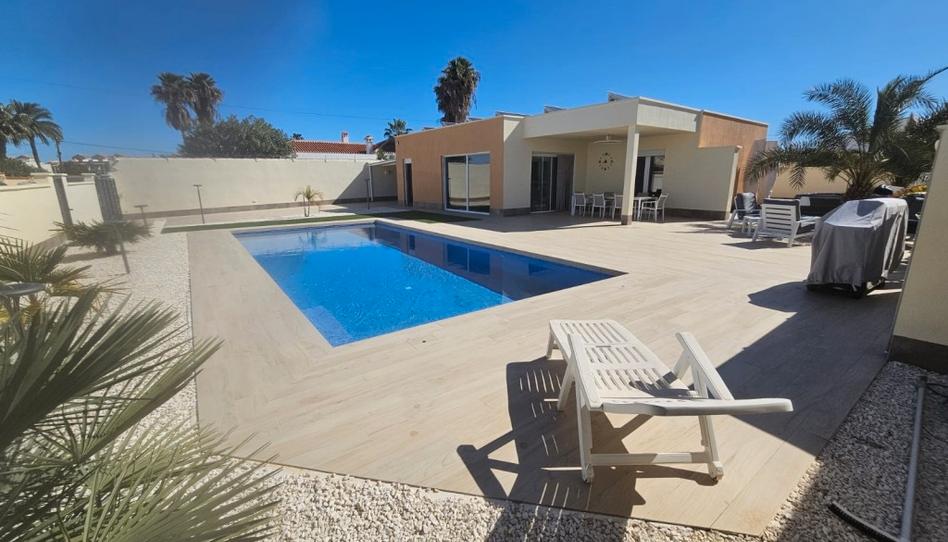 The villa has all rooms on the ground floor and features a spacious living room with a dining area and an integrated, modern kitchen with a breakfast bar, a spacious utility room, 4 bedrooms, and 2 bathrooms. Air conditioning. Sold furnished.