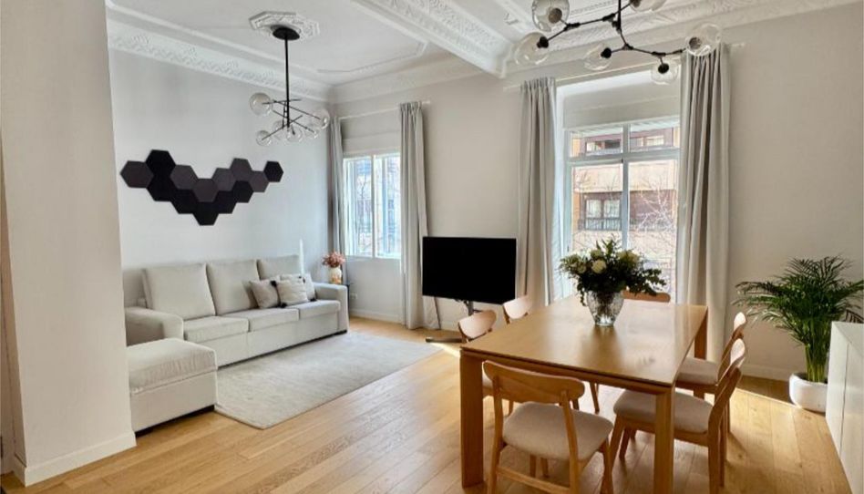 Situada en la tercera planta de un edificio señorial con ascensor, elegante vivienda completamente reformada de 94 m², con techos altos y dos balcones orientados este-oeste.