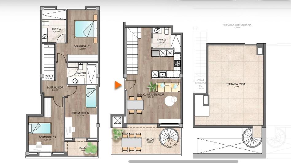 Dúplex 1º 3ª: 106,32 m2 construidos | 90,49 m2 útiles + 48,65 m2 exteriores (terraza 32,57 m2 + balcones). Precio: 345.000€.