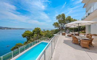 Esta reformada villa ofrece impresionantes vistas al mar debido a su ubicación privilegiada directamente frente del mar. Uno de los aspectos más destacados es el acceso privado al mar que no todas las propiedades en primera línea de mar pueden ofrecer. En una generosa parcela de 1.464 m2 se encuentra esta villa única con una superficie construida de 487 m2 que ofrece un salón abierto con chimenea en un lado y una sala de estar y comedor abiertos con impresionantes vistas al mar en el otro lado, dividido por una escalera que conduce al piso superior. Las vistas al mar son visibles desde la cocina amueblada y desde los dormitorios. La villa ofrece un total de cuatro dormitorios, cuatro baños, sauna, lavadero, garaje, un jardín con una gran piscina, varias terrazas cubiertas y soleadas y vecinos en un solo lado (el otro lado es una hermosa zona verde). La villa fue construida en 2000, fue completamente renovada el año pasado (2020) incluida la piscina. La propiedad ofrece increíbles vistas panorámicas de toda la bahía de Palma con Puerto Portals, Costa d'en Blanes y Punta Negra. Llámenos para recibir más información o para reservar una visita a esta impresionante villa con acceso privado al mar en Torrenova. Palma Nova, un popular centro turístico conocido por sus preciosas playas, pero también con una población residencial, pertenece al municipio de Calvià, una de las zonas cosmopolitas más importantes de Mallorca. Varios campos de golf se encuentran a 5-10 minutos en coche. Palma y el aeropuerto internacional se encuentran a 20 minutos en coche. Para obtener más información, póngase en contacto con BALEARIC PROPERTIES ESTATE AGENTS MALLORCA por correo electrónico o llame a la oficina de Puerto Portals (+34) 971 68 40 00 - Ver más detalles sobre otros Chalets en Palmanova o solicite información para comprar un chalet en Palmanova. "Balearic Properties ha estado en el sector de immobiliaria durante muchos años. La sede de la compañía está en Mallorca y con los años, hemos acumulado una incomparable cartera de propiedades para todos los presupuestos, por medio de la cual tenemos ya ha ayudado con éxito a 10.000 clientes a encontrar su nuevo hogar en las Baleares. Nuestras empresas de gestión de proyectos y construcción ofrecen una gama única de villas ""llave en mano"" lujosas para satisfacer todas las necesidades individuales y personales. También ofrecemos más de 200 villas vacacionales que garantizan a nuestros clientes una experiencia inolvidable. Balearic Properties es el socio exclusivo de Savills en Mallorca. La empresa ofrece a los clientes una gran experiencia de más de 20 años en el mercado inmobiliario local. Nuestra cartera incluye todo tipo de villas modernas, casas de campo y nuevos desarrollos que están de moda en las mejores zonas de Mallorca. Balearic Properties también se especializa en propiedades de primera linea al mar y grandes propiedades. La empresa ofrece un servicio completo de propiedades que incluye administración de propiedades, alquileres de vacaciones, administración de proyectos y servicios legales."
