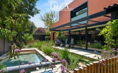 DIZA Consultores les presenta en exclusiva este magnífico chalet en venta, situado en una de las zonas residenciales más tranquilas y demandadas de Madrid. Venta directa y con disponibilidad inmediata. La propiedad se levanta sobre una parcela de 252 m² y ofrece una vivienda de 141 m² construidos, distribuidos en dos cómodas plantas que combinan funcionalidad, confort y estilo. Uno de sus mayores atractivos es su espectacular jardín privado, un auténtico oasis de vegetación cuidadosamente diseñada, donde destacan una piscina de diseño, zona de barbacoa ideal para reuniones familiares y sociales, y un acogedor cenador que invita al relax durante todo el año. Además, dispone de un espacio habilitado como garaje. En el interior, la vivienda sorprende por su calidez y distribución práctica: Planta principal: amplio salón independiente, comedor luminoso y una moderna cocina amueblada con electrodomésticos de alta gama, pensada para los amantes de la gastronomía; un dormitorio con baño en suite y un aseo de cortesía completan esta planta. Planta superior: dormitorio principal con vestidor, baño en suite y grandes ventanales que inundan los espacios de luz natural, ofreciendo unas vistas despejadas y privilegiadas. Convertimos Sueños en Hogares