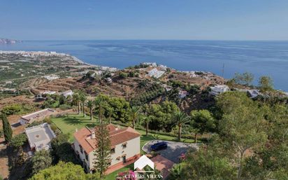Cumbre Villas presenta esta villa de estilo hacienda en venta en Nerja, situada en una ubicación privada sobre una parcela de 9.000 m² con hermosas vistas al mar y a la montaña, y a menos de 10 minutos de la playa y del centro. La propiedad cuenta con un largo camino de entrada privado, un garaje doble, amplios interiores y un gran jardín tropical con piscina. La planta baja incluye una amplia cocina con comedor y un salón conectado con un porche cubierto y una terraza abierta con barbacoa de obra. En esta planta también hay dos dormitorios, un baño y un lavadero. La primera planta ofrece tres dormitorios adicionales, dos de ellos con baño en suite. La vivienda dispone de aire acondicionado y chimenea. La casa dispone de varias terrazas y se puede caminar alrededor de toda la vivienda, lo que conecta perfectamente los espacios exteriores. La propiedad está rodeada de jardines muy cuidados con árboles frutales tropicales y palmeras. Contacte con Cumbre Villas para más información o para concertar una visita.