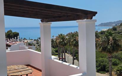 Descripción de la propiedad : Dúplex en venta en Mojácar. Una fantástica oportunidad de comprar un dúplex de tres dormitorios y dos baños en una ubicación privilegiada con impresionantes vistas al mar y a la montaña. A solo unos minutos a pie de las hermosas playas de arena, tiendas y la mejor selección de bares y restaurantes que Mojácar tiene para ofrecer. La entrada independiente nos lleva a una soleada terraza con vistas al mar y al abrir la puerta principal, a la izquierda encontramos un cómodo baño de invitados con ducha y a la derecha un dormitorio doble con armarios empotrados perfecto para visitas familiares. Siga el pasillo hasta una cocina de buen tamaño totalmente equipada con una apertura al salón-comedor con abundante luz natural. Las puertas de vidrio nos conducen desde la sala de estar a la hermosa terraza con impresionantes vistas al mar y las montañas circundantes, perfecta para cenar al aire libre y entretenerse. La escalera de mármol nos lleva a un segundo baño familiar completo y a los dos dormitorios, el tercer dormitorio es extremadamente grande con dos camas dobles, armarios empotrados y puertas de cristal con acceso a la segunda terraza con amplias vistas al mar y la montaña. La piscina comunitaria de tamaño generoso está adornada con árboles y plantas maduras, perfecta para relajarse después de un día en la playa. Aire acondicionado frío/calor, aparcamiento fuera de la calle y armarios empotrados, esta propiedad sería una casa de vacaciones perfecta o una casa ideal para vivir todo el año. Características principales - Vistas al mar y a la montaña. - 2 baños - Terrazas privadas - Piscina comunitaria - Estacionamiento fuera de la calle - Jardín bien cuidado - Cerca de todos los servicios - Gastos de comunidad al mes: 55€ - Cuota IBI al año: 220€