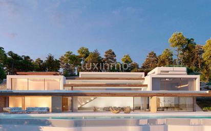 Esta moderna villa de lujo ubicada en primera línea, en la zona de Es Cubells, se encuentra actualmente en proceso de construcción. La villa está diseñada con un estilo arquitectónico moderno, y cuenta con 1076m2 de superficie construida, en una parcela de 1900m2. Está distribuida en tres plantas, accediendo a ella desde la planta superior, donde se encuentran dos de los dormitorios. Seguidamente en la planta central, en una gran zona diáfana de 155m2 se encuentra el gran salón comedor, y junto a ella, una amplia cocina abierta parcialmente de 47m2. Y en la planta inferior, se encuentran los 3 dormitorios restantes. Todo los dormitorios de la villa cuentan con su propio baño integrado, además de haber dos aseos adicionales, uno en la planta principal, y otro en la planta inferior. Dispone de un gran garaje cerrado en la planta inferior de 220m2, y una pérgola destinada como zona de estacionamiento, de 50m2 junto a la entrada. Esta exclusiva villa está orientada al sur, ofrece impresionantes vistas al mar, y con una gran piscina desbordantes, y una lamina de agua en la planta superior. EQUIPAMIENTO Cuenta con una gran terraza de 110 m2, plaza de aparcamiento para 2 coches, y 4 garajes privados. Dispone de equipos de bombas de calor aerotérmicas para a producción de agua caliente sanitaria, calefacción y también refrigeración si se desea, combinados con energía solar térmica fotovoltaica. Sistema de energía solar térmica con captadores en cubierta en posición plana prácticamente invisible a la vista. También cuenta con sistema de domótica, suelo radiante y osmosis en la cocina. Además de sistema de alarma, ventanas con doble acristalamiento y persianas eléctricas ZONA:. La propiedad está situada en exclusiva zona de Es Cubells, conocida por su belleza natural y sus impresionantes playas, y se encuentra a unos 15 km del aeropuerto. Esta lujosa casa moderna es una gran oportunidad de inversión para aquellos que buscan una espaciosa casa familiar en una hermosa ubicación. La combinación de arquitectura moderna, características de lujo e impresionantes vistas al mar hacen de esta propiedad una visita obligada