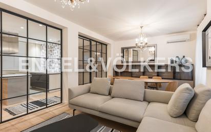 Engel & Völkers presenta este piso de diseño ubicado en el céntrico barrio de Ríos Rosas, en el distrito de Chamberí. La vivienda ha sido reformada con altas calidades y se ofrece amueblada. El salón y los dormitorios son exteriores, ya que se ubican en un chaflán orientado a este y a sur. El recibidor da paso a una espectacular cocina que puede abrirse completamente al salón comedor o independizarse mediante unas elegantes puertas correderas realizadas con vidrio y carpinterías de hierro. La cocina (de la marca italiana Valcucine) está equipada con electrodomésticos de alta gama (placa de inducción, campana extractora de gran capacidad, horno, microondas, lavavajillas, frigorífico, lavadora y secadora), y da acceso a un pequeño patio privativo. El salón comedor cuenta con dos grandes ventanales orientados a este. Se distribuye en dos ambientes decorados con muebles de la marca italiana Zanotta. El piso cuenta con tres dormitorios dobles (el principal en suite), amueblados con camas y colchones de alta calidad, de la firma italiana Flou. Los dos baños están equipados con ducha. Ambos disponen de ventilación natural. La calefacción es central individualizada y posee también aire acondicionado (bomba calor-frío). El piso tiene además una gran capacidad de almacenamiento (hay un gran número de armarios empotrados en la entrada, pasillo y todos los dormitorios). El edificio en el que se ubica la propiedad posee portero automático y físico. Hay posibilidad de alquilar plazas de garaje en la zona. NO ADMITE ESTUDIANTES NI COMPAÑEROS DE PISO. El piso se encuentra en el distrito de Chamberí, en el barrio de Ríos Rosas, a pocos metros del intercambiador de Nuevos Ministerios (en el que confluyen las líneas 1, 6, 8 y 10 de metro, Renfe Cercanías), y con acceso directo a la salida de la A6 y el Paseo de la Castellana. En una zona con gran vida comercial y social, muy cerca de El Corte Inglés y de calles con restaurantes de moda como Ponzano.